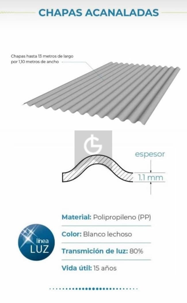 Éste producto de usos múltiples cambia la perspectiva a la hora de construir y decorar gracias a sus particulares características y propiedades únicas. Gracias a su color blanquesino permite una óptima difusión de luz sin que se vea afectada la privacidad del ambiente aportando ahorro de energía por luz natural, y al ser livianas y flexibles son muy fáciles de instalar, ya sea en su formato de chapa lisa como en la acanalada para techo que además coincide con la forma de onda de la chapa acanalda común que se usa habitualmente (línea acanalada cincalum y galvanizada TERNIUM (R)). Su alta resistencia mecánica y térmica lo convierte en un producto de seguridad, ya que soporta golpes, dobladuras, rajaduras y altas temperaturas climáticas. Posee protección UV y además es anti hongo, por lo tanto es incorrosible y no se amarillea, practicamente no sufre deterioro con el paso del tiempo, ni siquiera el producido por las aves como sucede con las chapas plásticas fabricadas en fibra de vidrio. Su formato liso no solo permite su uso en laterales y ventanas sino también en la fabricación de mampáras y publicidades backlight (publicidades iluminadas de atrás)